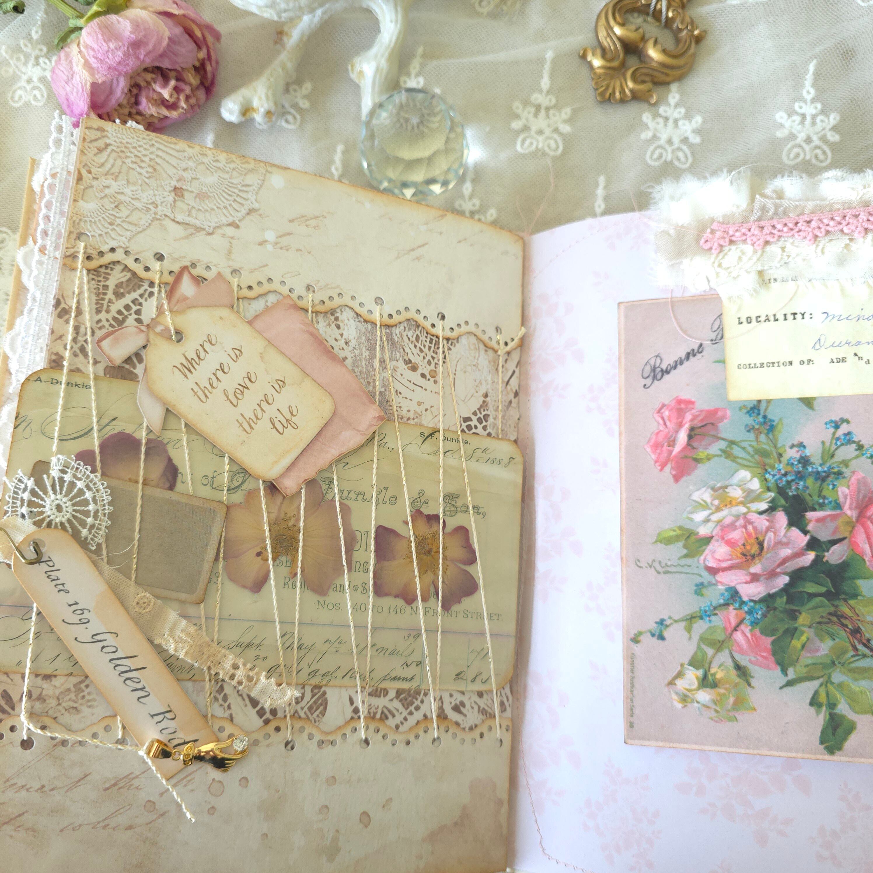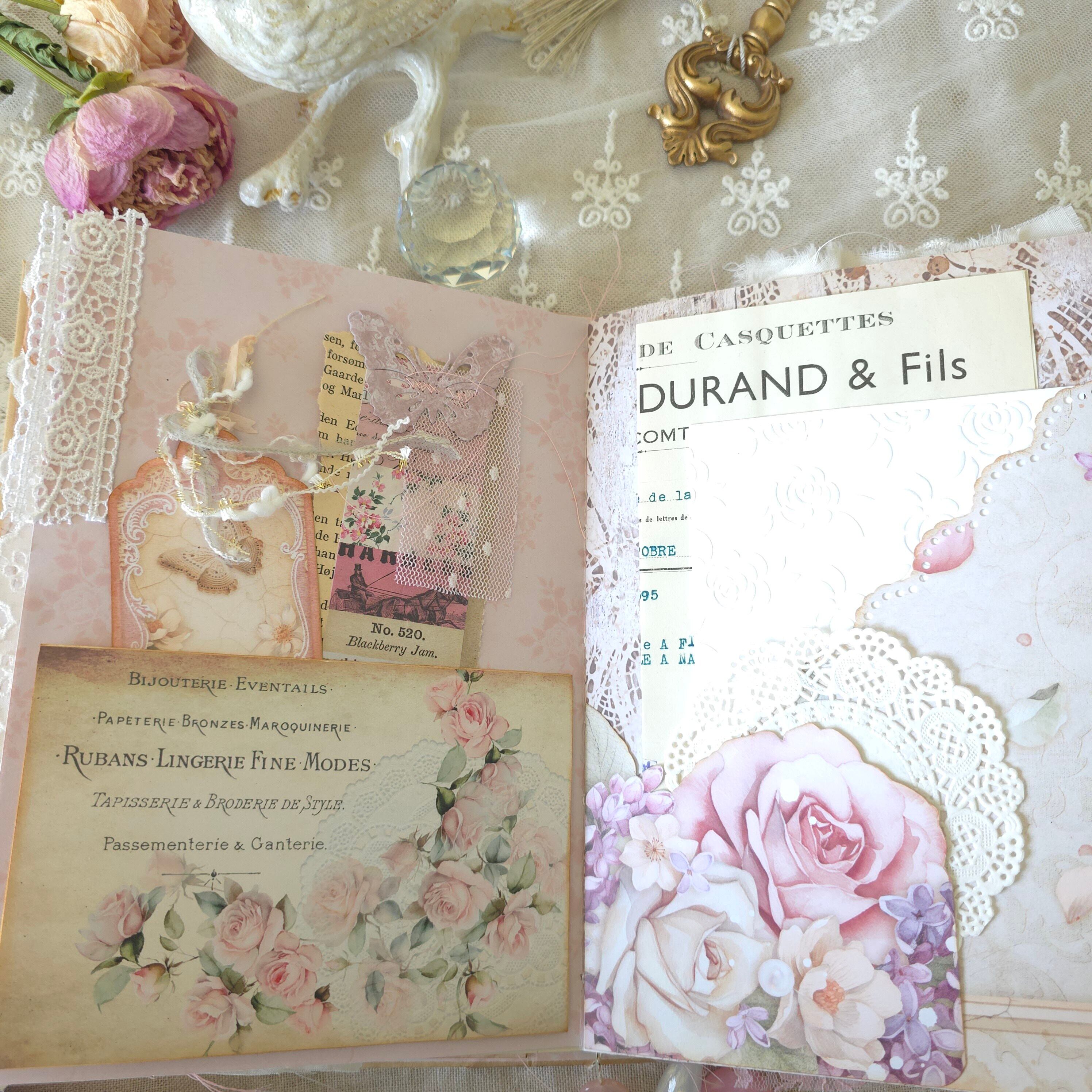 ファブリック、レース、ボタン、リボン、中はコーヒー染ペーパー、アンティークペーパー、ヴィンテージペーパー、洋書の切り離し、デジタル素材などで構成されています。