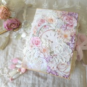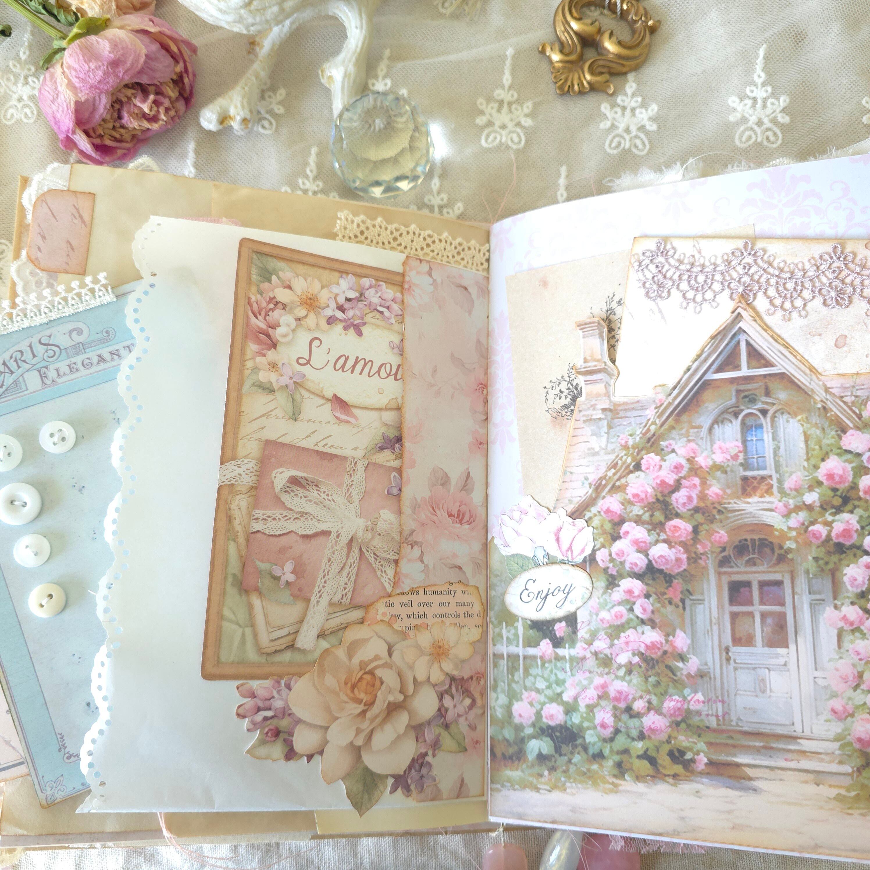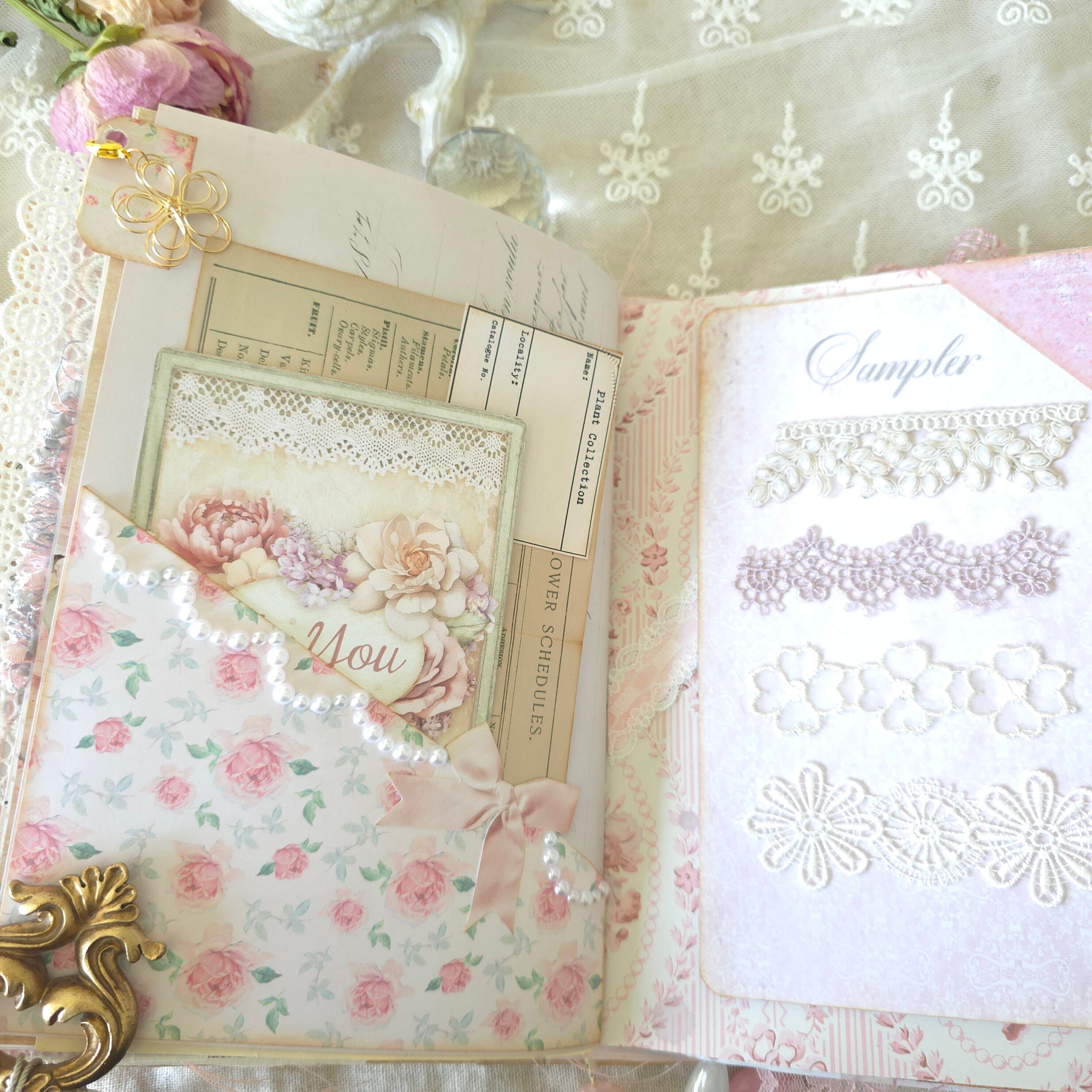 スタンぺリア社の「Romance forever」ペーパーパッドをつかいきり、お花に囲まれたような雰囲気のジャーナルに仕上げました。