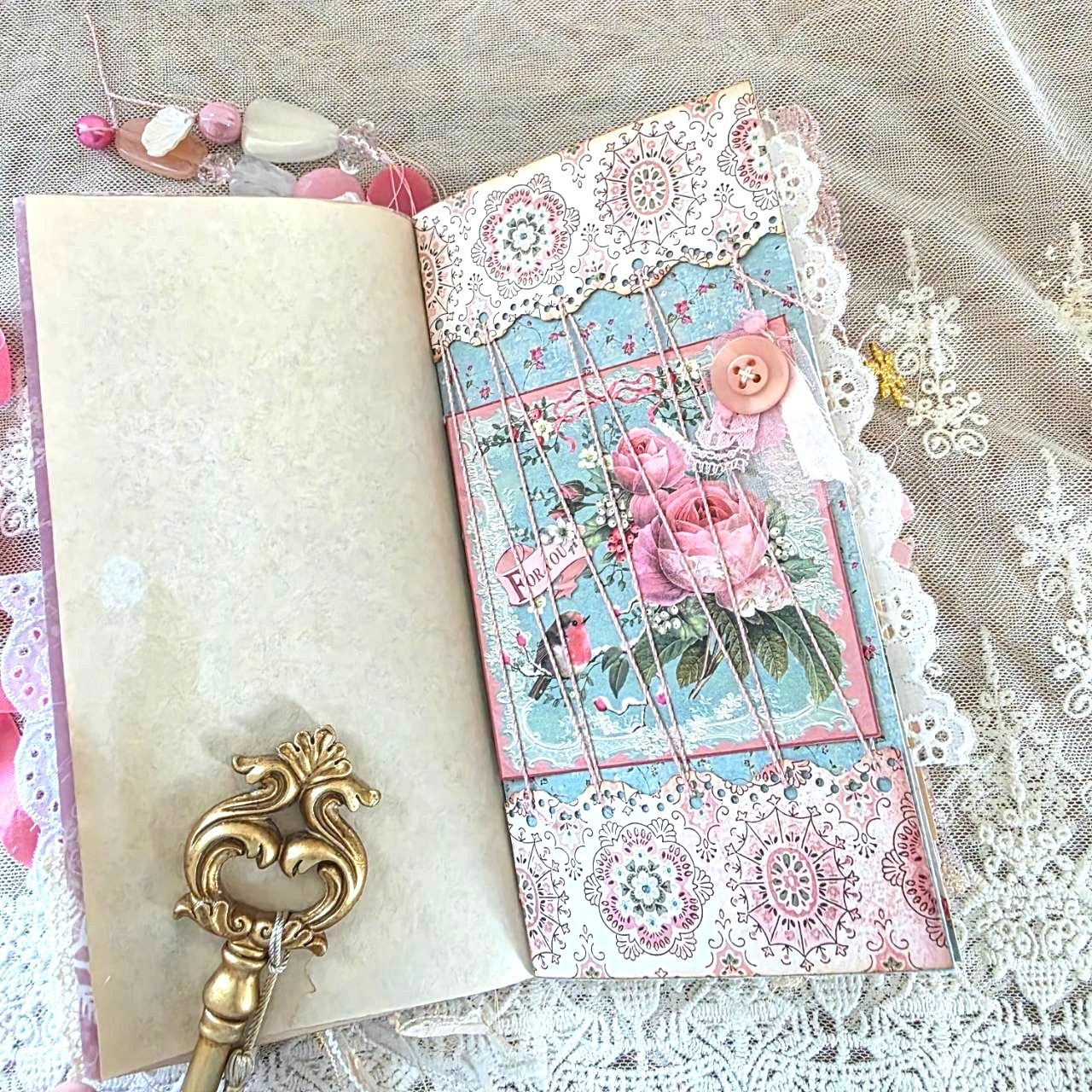 スタンぺリア社の「PINK Christmas」ペーパーパッドの8インチサイズを使用し、ピンクとバラを中心に甘い雰囲気のクリスマスジャーナルに仕上げました。