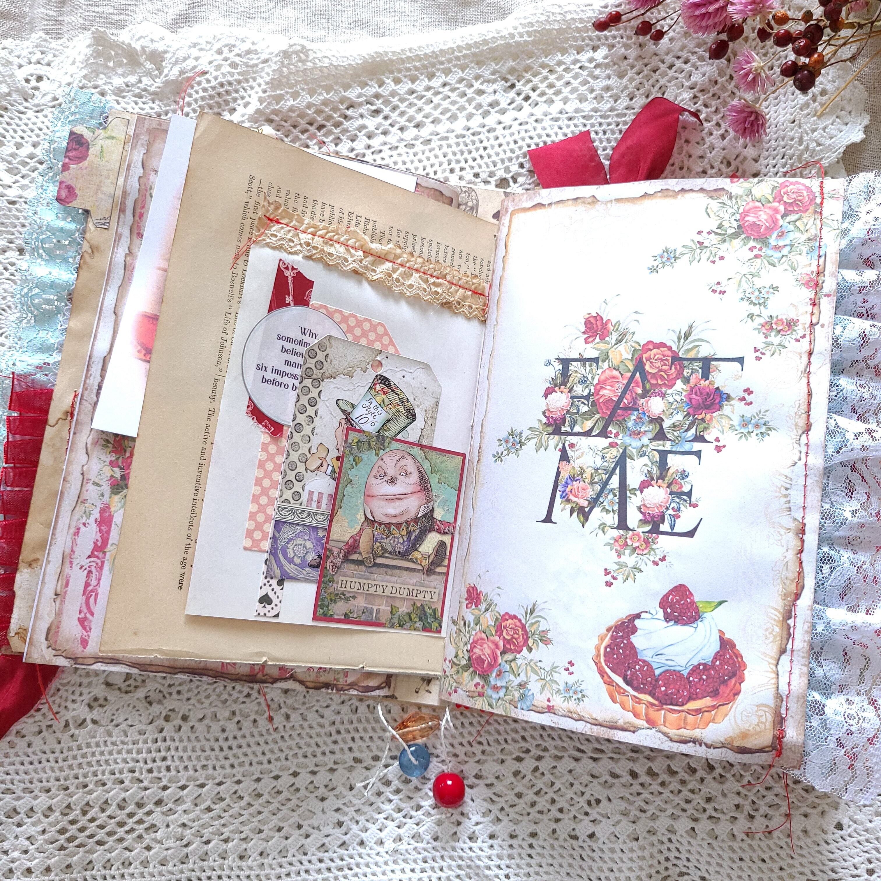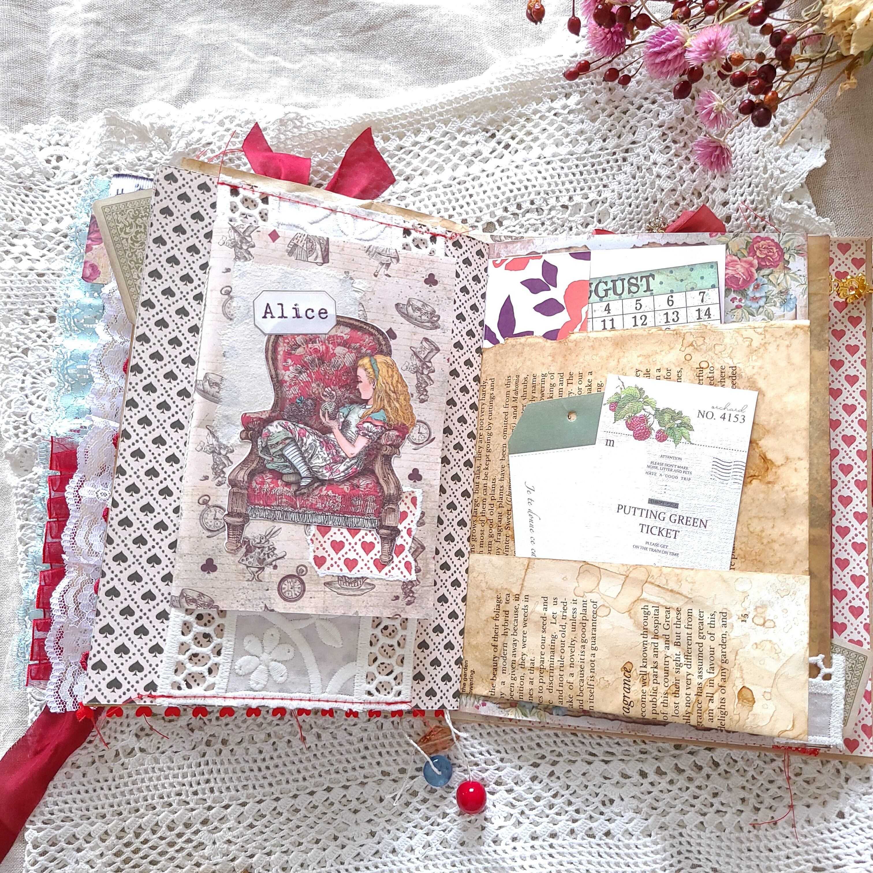 不思議の国のアリス、鏡の国のアリスをテーマに制作したA5サイズのジャンクジャーナルです。