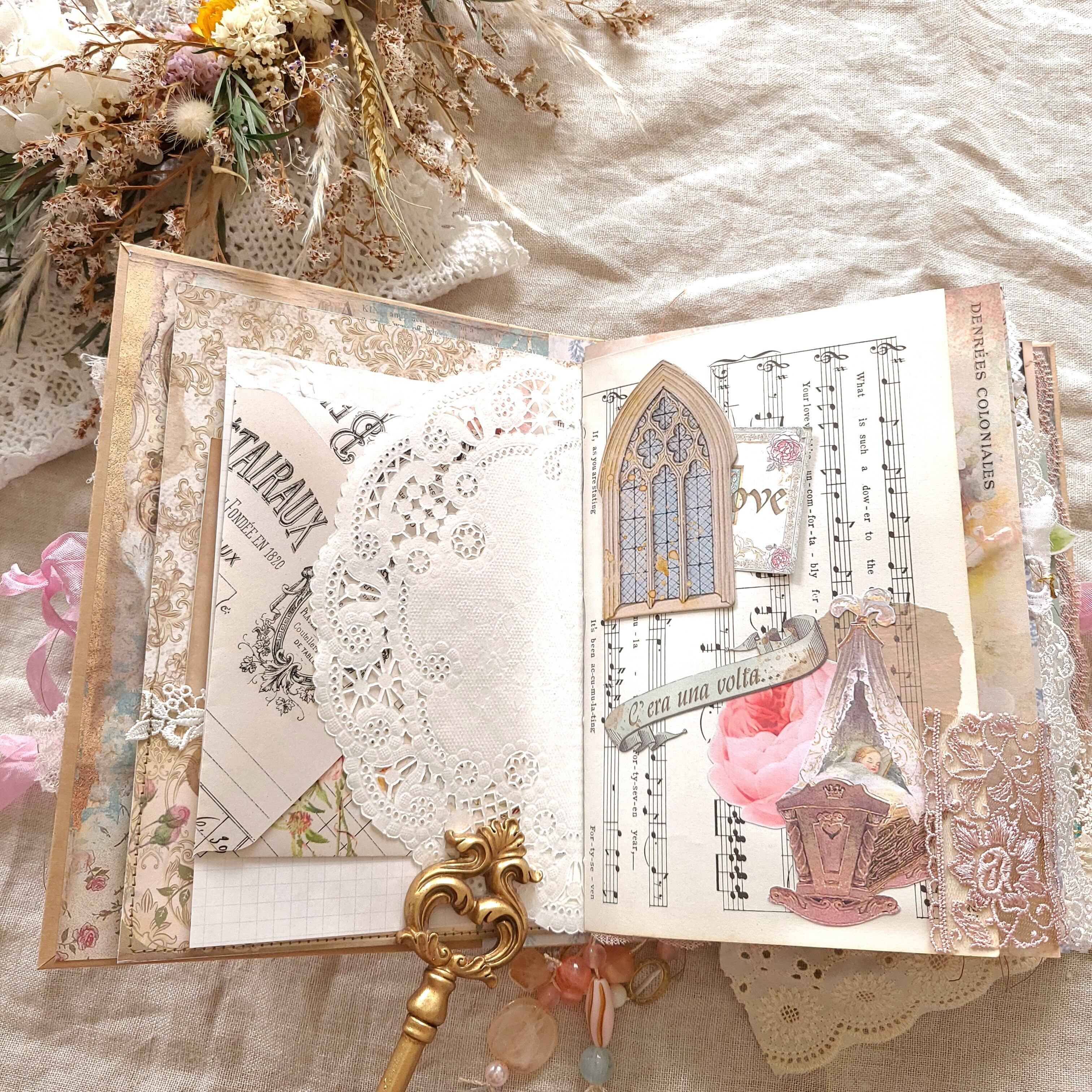 表紙はファブリック、レース、ボタン、リボン、中はコーヒー染ペーパー、アンティークペーパー、ヴィンテージペーパー、洋書の切り離し、デジタル素材などで構成されています。